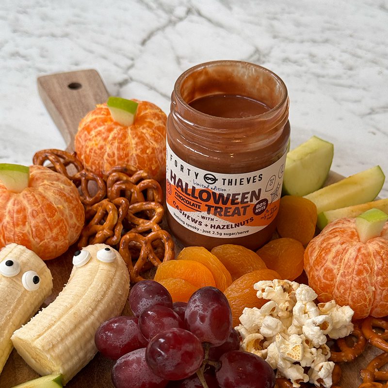 Hosting a halloween party of movie night? Sink your teeth into this eerie-sistible platter stacked with fruit, popcorn, and a jar of our Halloween Chocolate Treat Butter.