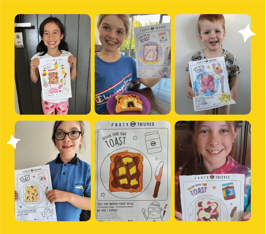 Win 1 of 6 Forty Thieves prize packs! Our award-winning Cinnamon Donut and Chocolate Fudge Peanut Butters are super delicious on toast! Get the kids to draw their favourite toppings below and colour in the page for a chance to win 2x jars of each flavour.
