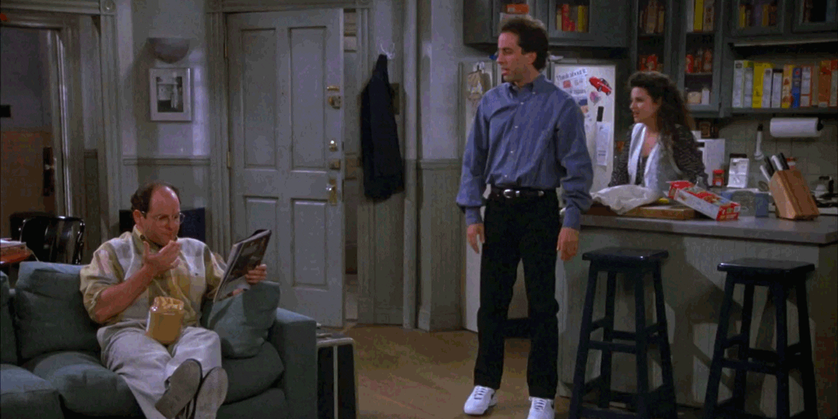 Elaine Benes (Julia Louis-Dreyfus) has just returned from Europe and is welcomed by her friends Jerry Seinfeld (Jerry Seinfeld) and George Costanza (Jason Alexander). She immediately walks in and helps herself to food in Jerry’s pantry, while George gets comfortable on the couch with Jerry’s jar of Peanut Butter, apologetically digging into with his fingers.