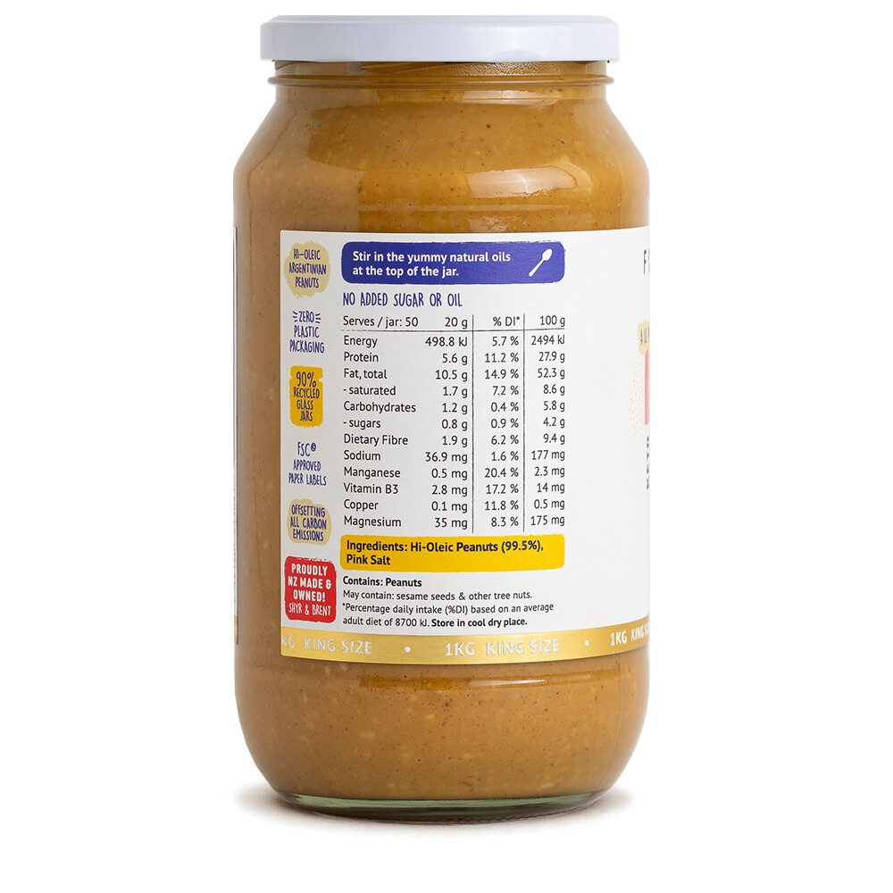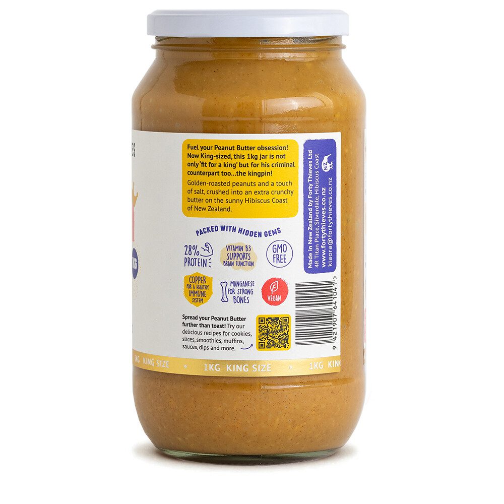 Now King-sized, this 1kg jar is not only ‘fit for a king’ but for his criminal counterpart too…the kingpin! Golden roasted peanuts and a touch of salt, crushed into an extra crunchy butter on the sunny Hibiscus Coast of New Zealand.