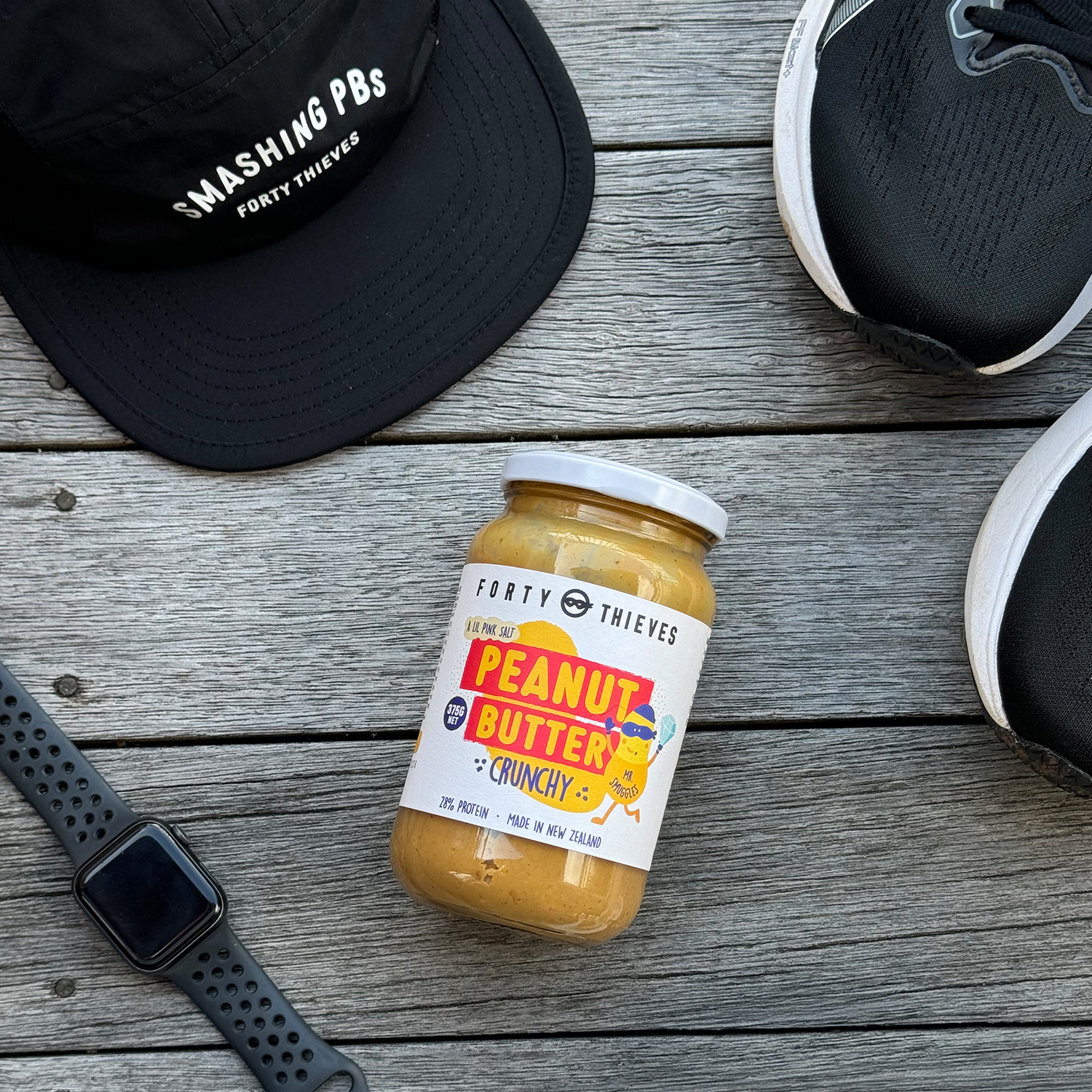 Lightweight, breathable, and built to move, it’s embroidered with SMASHING PBs™ – FORTY THIEVES on the front and FUELLED BY PEANUT BUTTER on the back.